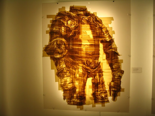 The subject matter is a suit of ceremonial armor, perfect for a classic figure study, accenting detail and exercising the artist's ability to sketch in light and shadow. Mark suggests it all simply by layering tape over a backlit panel. Without the light, the figure would be a barely differentiated mass of muddy brown. With the light shining through it becomes detailed, elegant, even radiant. (to be continued . . .)