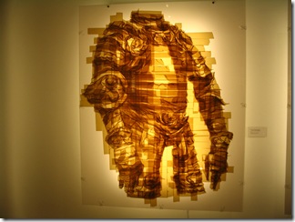 The subject matter is a suit of ceremonial armor, perfect for a classic figure study, accenting detail and exercising the artist's ability to sketch in light and shadow. Mark suggests it all simply by layering tape over a backlit panel. Without the light, the figure would be a barely differentiated mass of muddy brown. With the light shining through it becomes detailed, elegant, even radiant. (to be continued . . .)